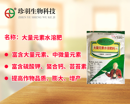 大量元素水溶肥料為經水溶解或稀釋,用于灌溉施肥、葉面施肥、無土栽培、浸種蘸根等用途的液體或固體產品,可以葉面施肥、浸種蘸根、灌溉施肥,灌溉包括噴灌、滴灌等方式進行灌溉時施肥,既節(jié)約用水,又節(jié)約施肥,而且還植物吸收快,大量元素水溶肥是一種可以完全溶于水的多元復合肥料,它能迅速地溶解于水中,更容易被作物吸收,而且其吸收利用率相對較高,我們看一下珍羽生物的大量水溶肥。